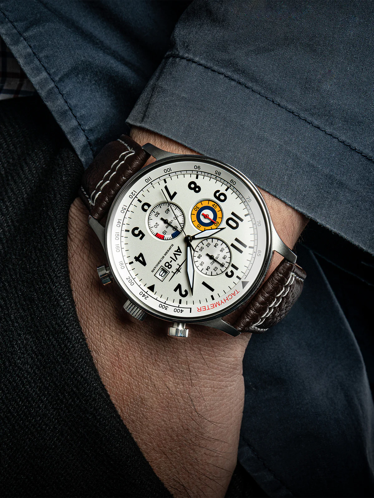 A tribute to arguably the most iconic plane from the WW2 era. The Hawker Hurricane Classic Chronograph is characterised by a simplicity that echoes the design of its namesake. Clean, bold lines surround the dial on which the colours and graphics celebrate the fighter plane’s simple but striking motif that identified the Hawker Hurricane.